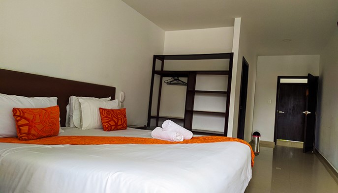 Amplia y cómoda habitación con cama king y dos camas sencillas. Balcón, baño privado y TV LCD.